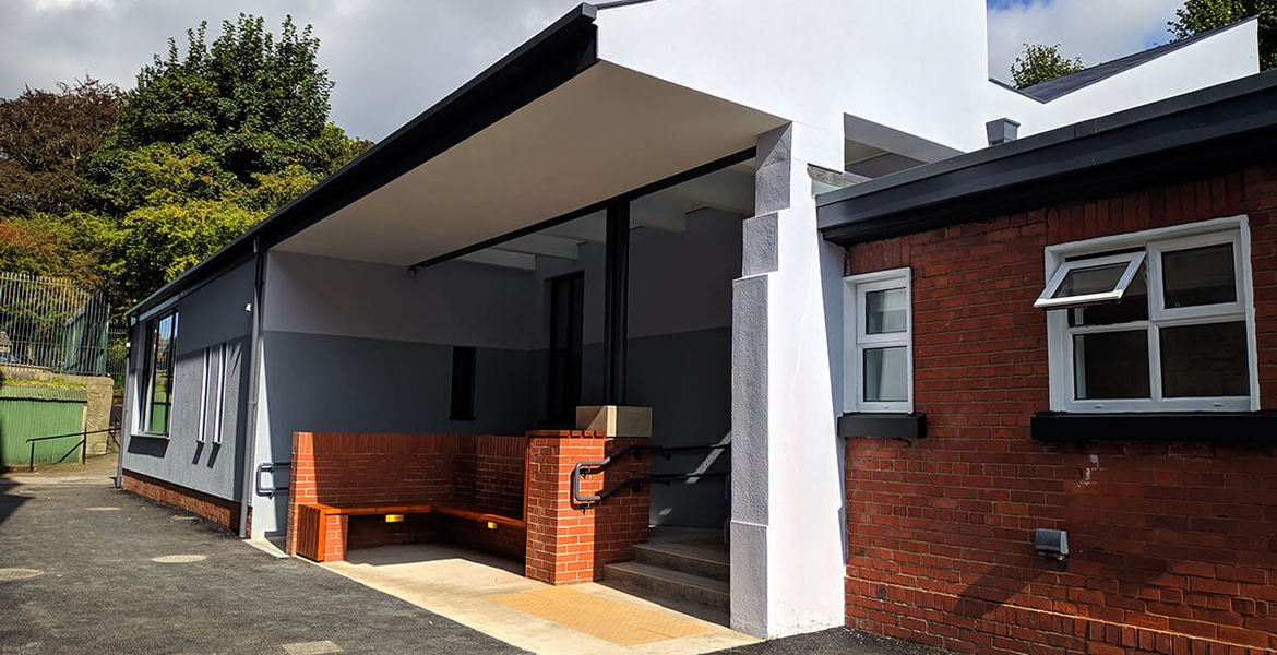 St Michael's National School sits on a discreet urban site, nestled between St Michael's Church and the People's Park. The recently completed extension creates a new, expanded external entrance area that benefits from high level east-light, while internally, new openings permit additional daylight to the enlarged entrance lobby, and additional classroom.